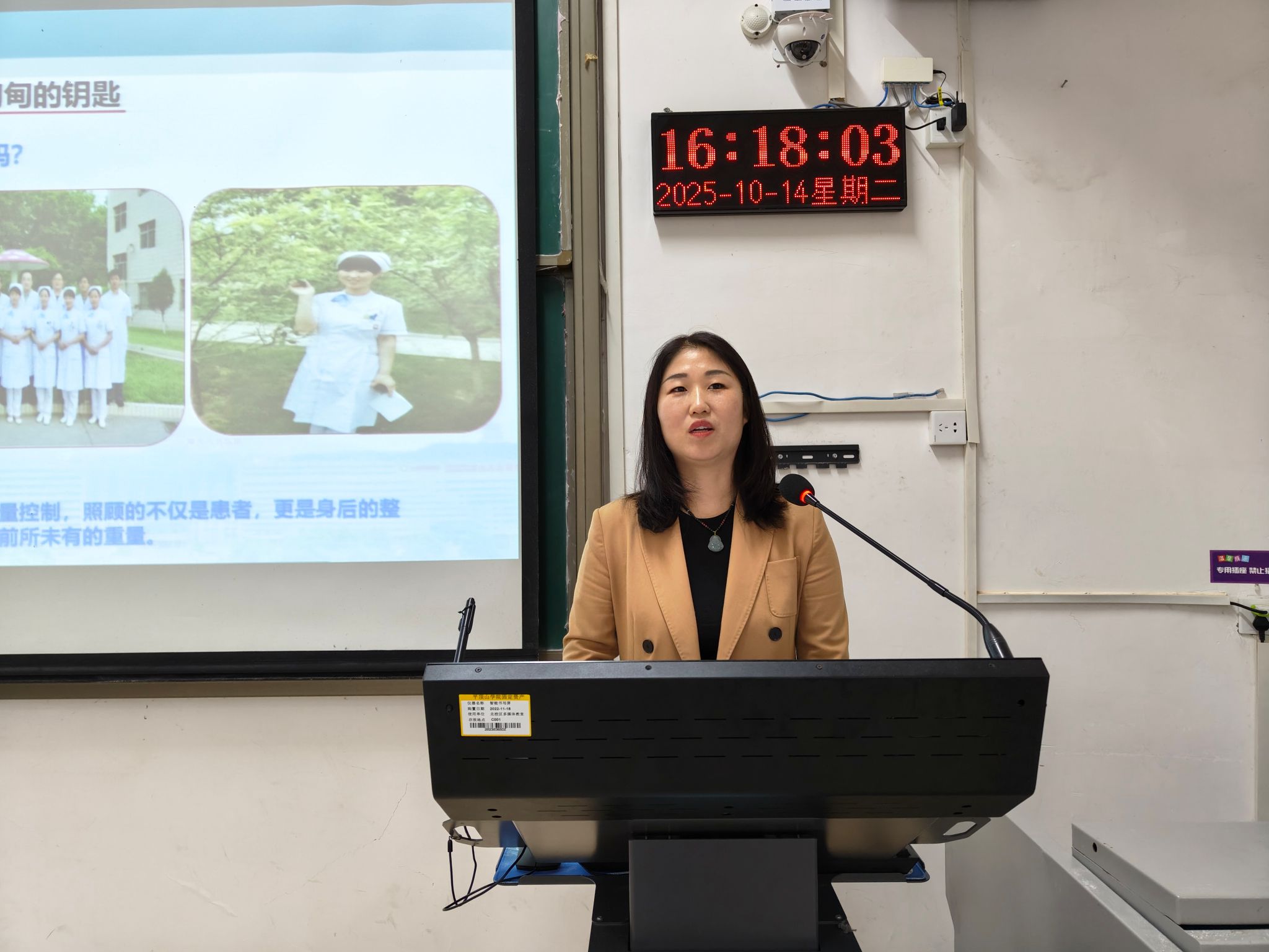 吴娜在讲座中勉励学生,既要以专业素养守护生命、坚定走好护理路,更从人文关怀角度引导大家心存大爱。同时建议同学们珍惜时代机遇,未来响应国家号召,从点滴小事积累经验,成长为合格护理人才。