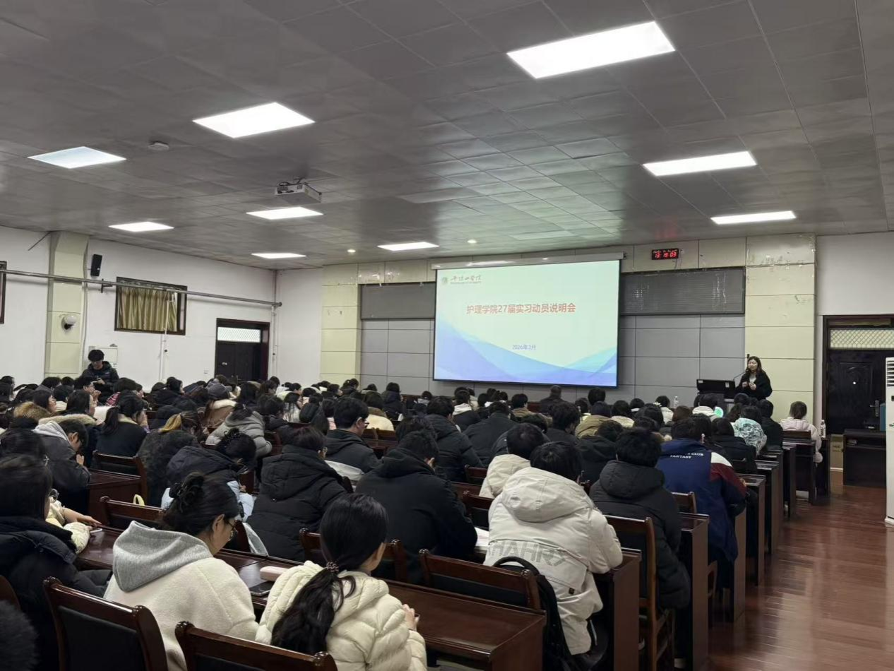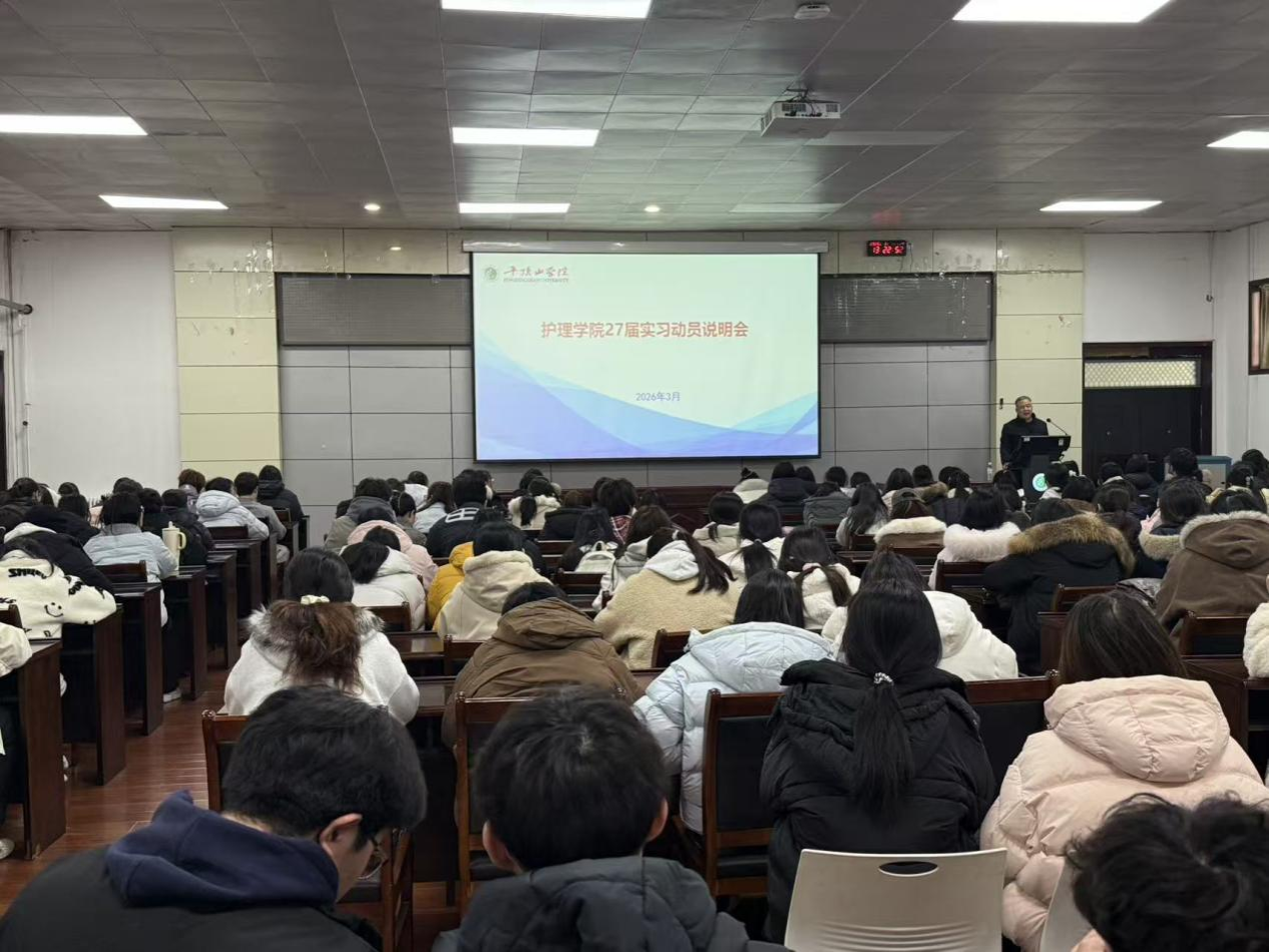 2026年3月5日,我院在教学楼A406多媒体教室召开2027届毕业实习动员说明会。护理学院院长夏西超、副院长袁凤娟出席,实习管理办公室主任余小柱主持会议,2023级护理学、康复治疗学专业全体学生参加会议。