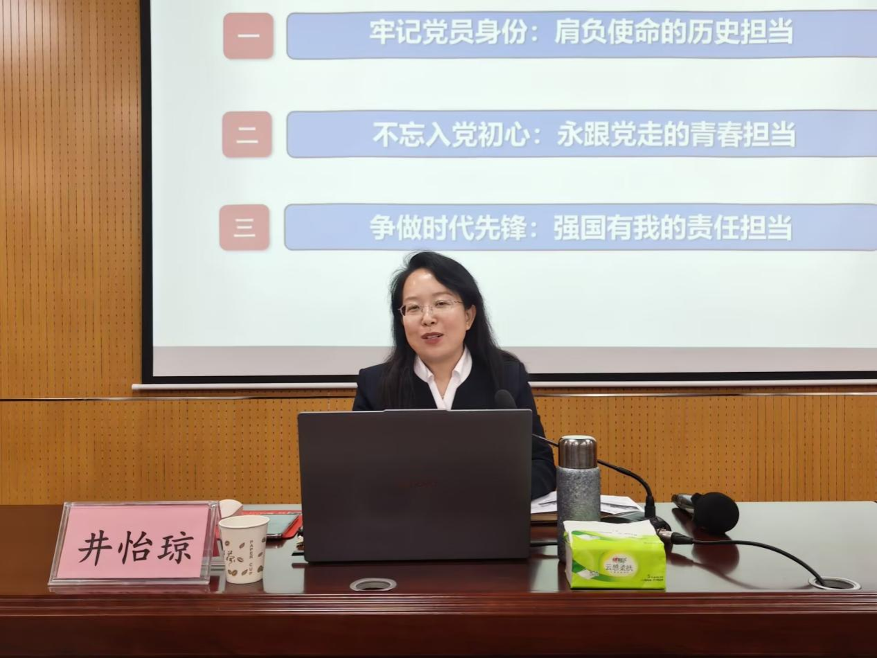 党课伊始,井怡琼以“理论清醒方能政治坚定”开篇,从党的名称溯源阐释初心使命,结合历史短片与党员结构数据,带领大家感悟党的为民初心与幸福生活的来之不易;随后围绕党员身份意识强化、入党初心与思想建设展开讲解,以鲜活案例说明党员身份重在行动践行,梳理党员标准历史演进,强调思想淬炼与日常践诺的重要性。