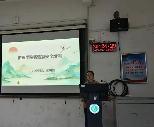 四位老师以“实验室安全:实践学习的生命线”为切入点,结合护理与康复专业实验特点,系统阐述了实验室安全的核心意义。培训内容涵盖了实验室安全守则、消防安全、水电安全、化学安全以及仪器设备使用安全等方面。通过培训,我院2025级本科学生初步树立了实验室安全理念,强化了安全意识,初步掌握了有效防范和消除安全隐患的知识和技能,为实验室学习筑牢了安全屏障,更以“开学第一课”的仪式感,传递了学院“育人为先、安全为基”的育人理念。