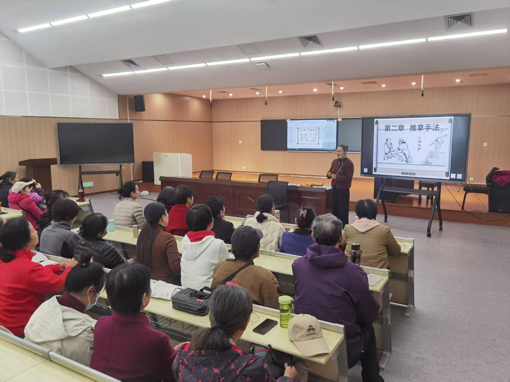 为了提升老年人的自我保健能力,增强老年人慢性病和疼痛性疾病自我防御及治疗技能,实现居家治疗常见病的目的。10月21日下午,我院组织张明霞老师携团队走进市老干部学习活动中心,以“推拿手法”为主题举办了一场专题科普讲座。此次活动吸引了80余名老年朋友的积极参与,大家热情高涨,互动性烈。