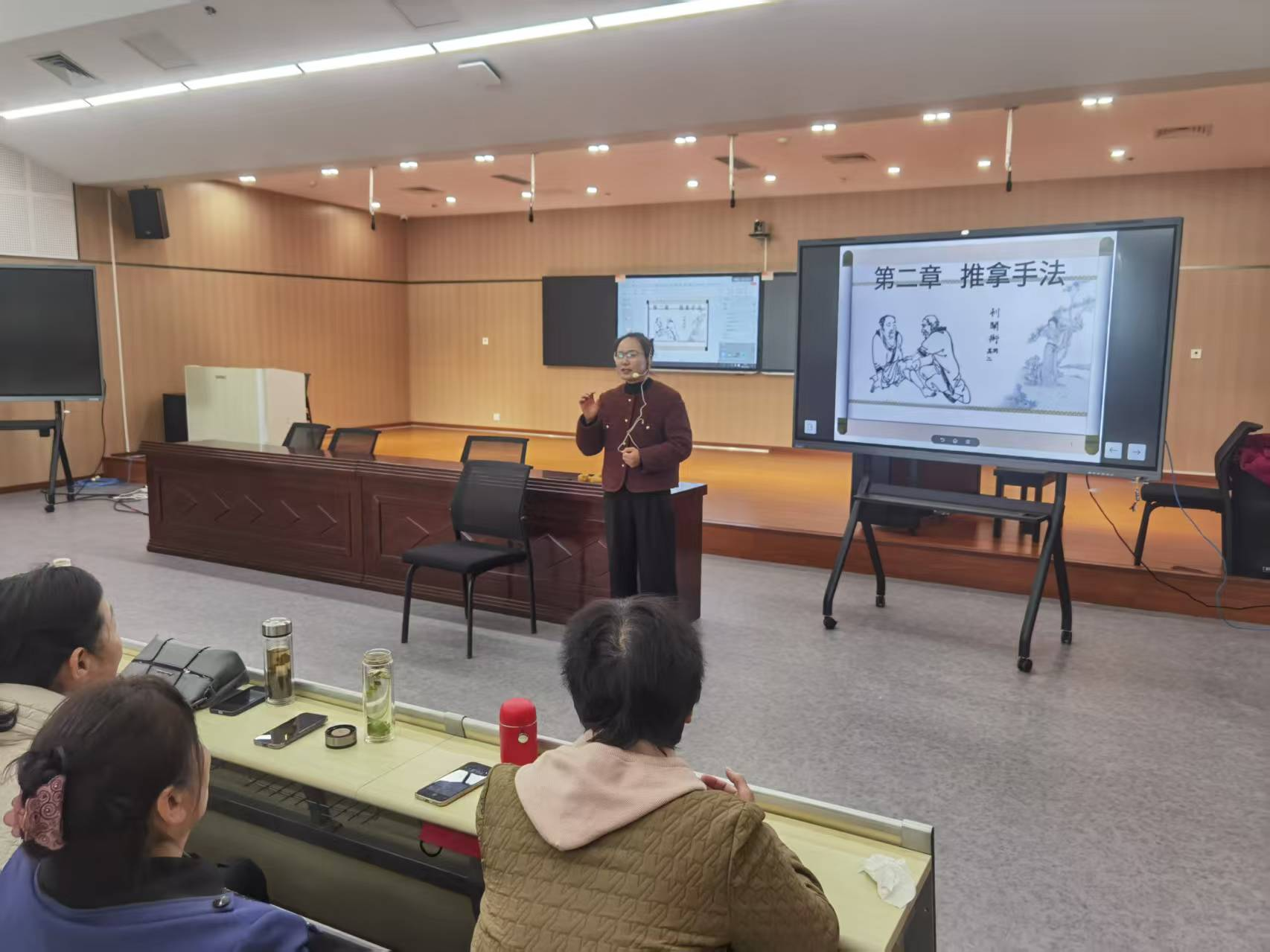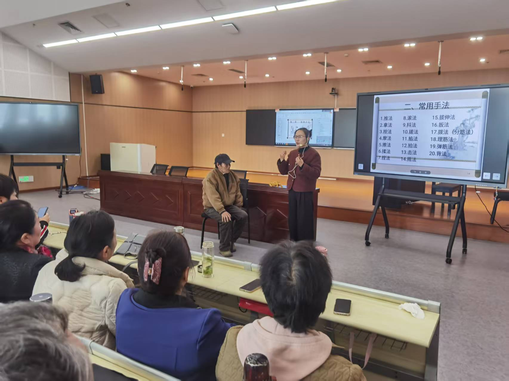 张明霞老师用通俗易懂的语言讲解了推拿的发展渊源、作用机理和适用症,重点围绕颈椎病、肩周炎、腰椎间盘突出、膝骨关节炎等老年人高发疾病,示范了拿、按、揉、推、擦、点、滚等多种基础手法,并强调“辨证施术、手法组合、因人制宜、多措举、恰到好处”的重要性。张明霞老师从“日常保健三穴”(风池、肩井、足三里)入手,手把手教大家学习居家推拿操,带领老同志在座位上完成了一整套安全、简易的经络放松动作。