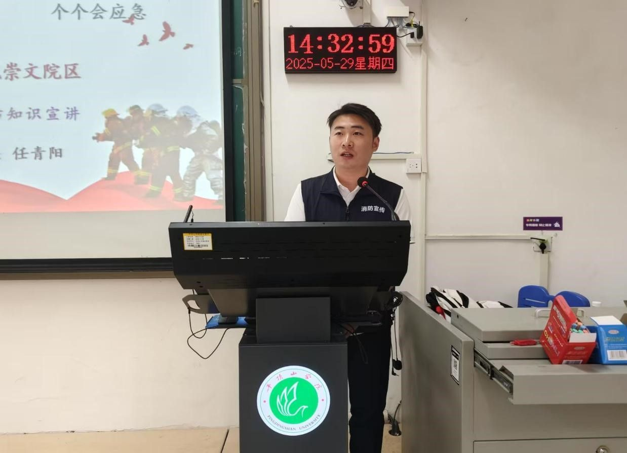 培训中,任青阳教员以校园及周边近年典型火灾案例为引,通过震撼的图片与视频,直观呈现火灾危害,让师生深刻认识火灾风险与防范必要性。知识讲解环节,任教员系统梳理火灾预防要点,涵盖电器规范使用、用火用气安全、消防设施检查等;同时详解应急策略,包括火警电话正确拨打、逃生路线选择及自救互救方法,助力师生构建科学消防知识体系。